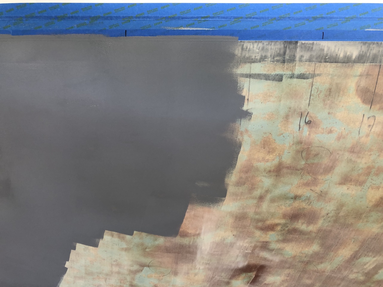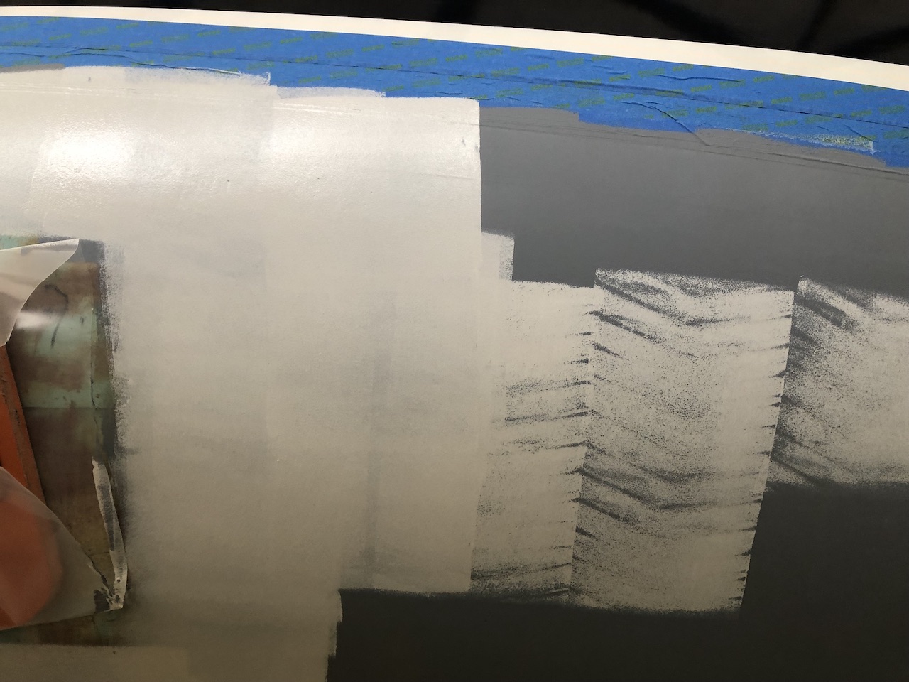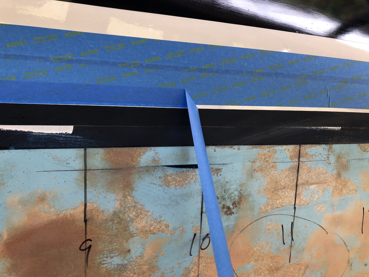 The next steps are to apply a barrier coat consisting of several coats of straight epoxy, then 4-6 coats of epoxy-based barrier coating primer. I began by masking off the boot stripe with several wide lengths of tape, then a double thickness of narrower tape along the bottom edge. The double thickness will not only provide additional protection while sanding, but I will be able to remove the outer layer after the epoxy coating, creating a fresh mask for the primer.