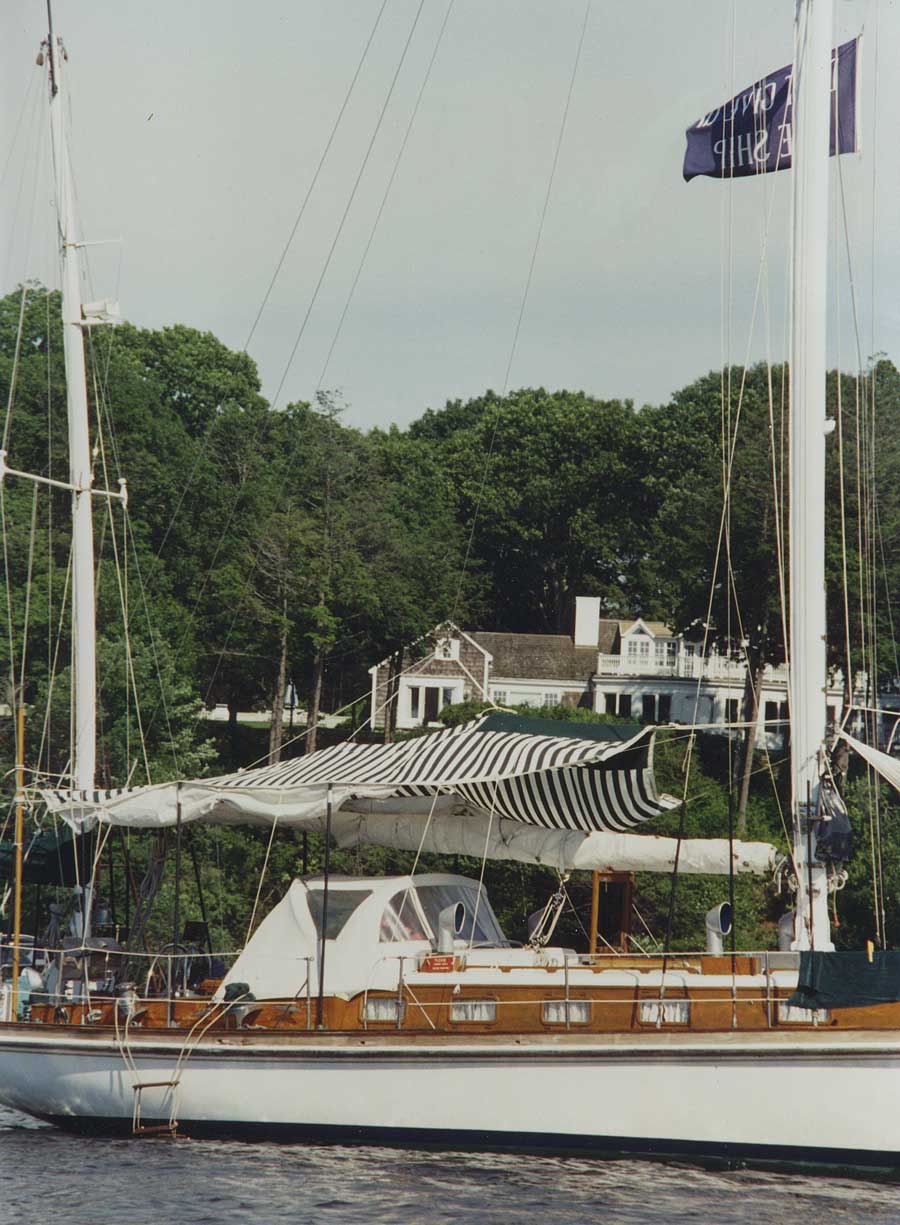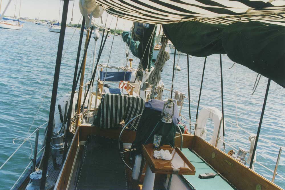 We can see about half of Thalassa’s cockpit here. Note the folding captain’s chair on the aft deck. This photo was taken by her previous in New Harbor in Block Island.
