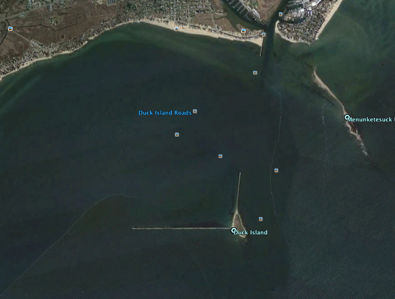 A satellite image of Duck Island and the entrance to Westbrook Harbor.