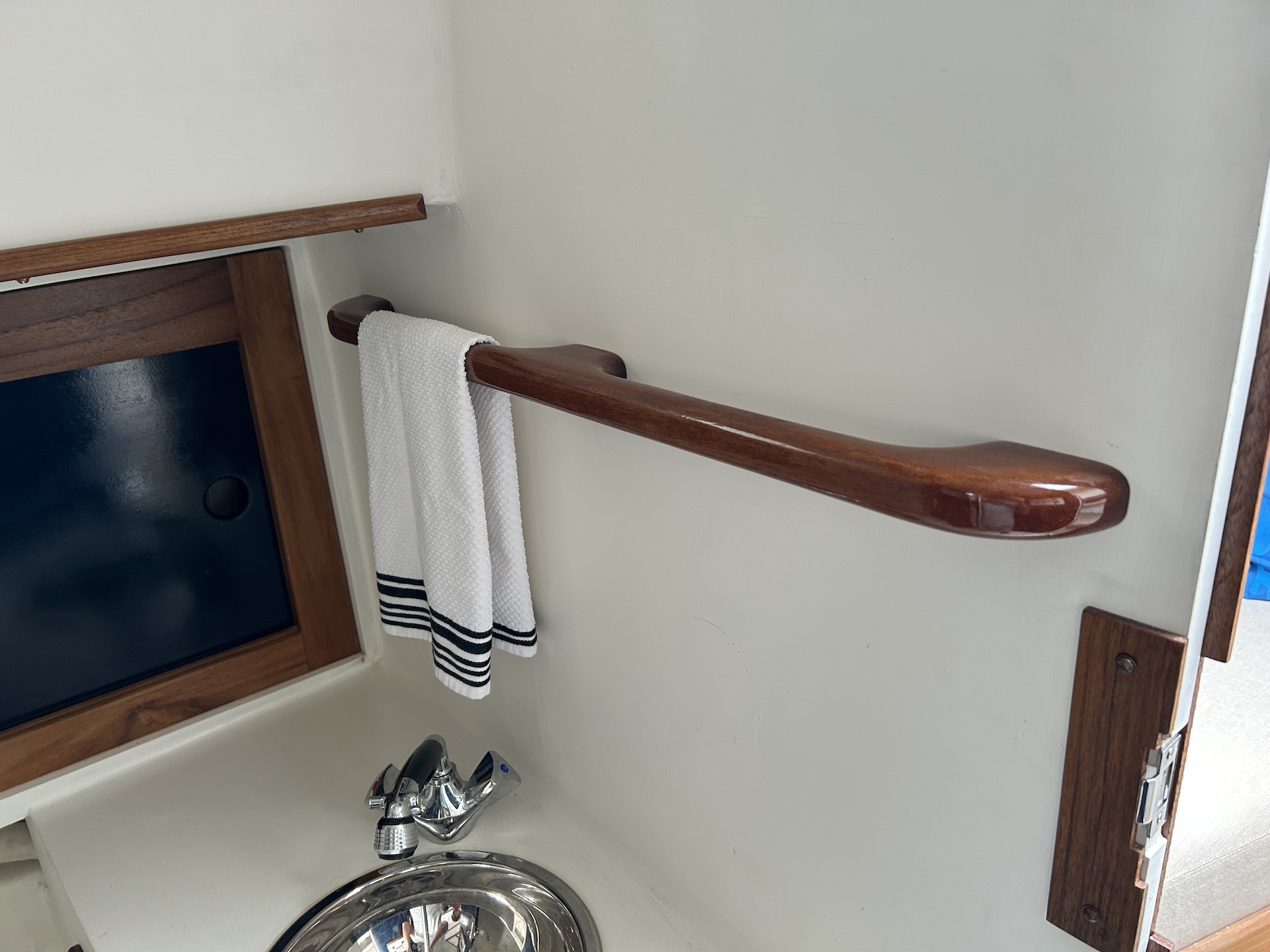 The main salon and galley area are surrounded by teak handholds, and the two compression posts in that area provide additional places to grab. The standing area in the forward cabin is a small enough so that handholds are unnecessary. The head contains the forward compression post, which provides a sturdy handhold, but I installed one of the two-loopers above the sink, and it doubles as a towel bar: